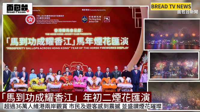 面包台「本地新聞報導」「馬到功成耀香江」年初二煙花匯演 超過36萬人維港兩岸觀賞 市民及遊客感到震撼 並盛讃煙花璀璨